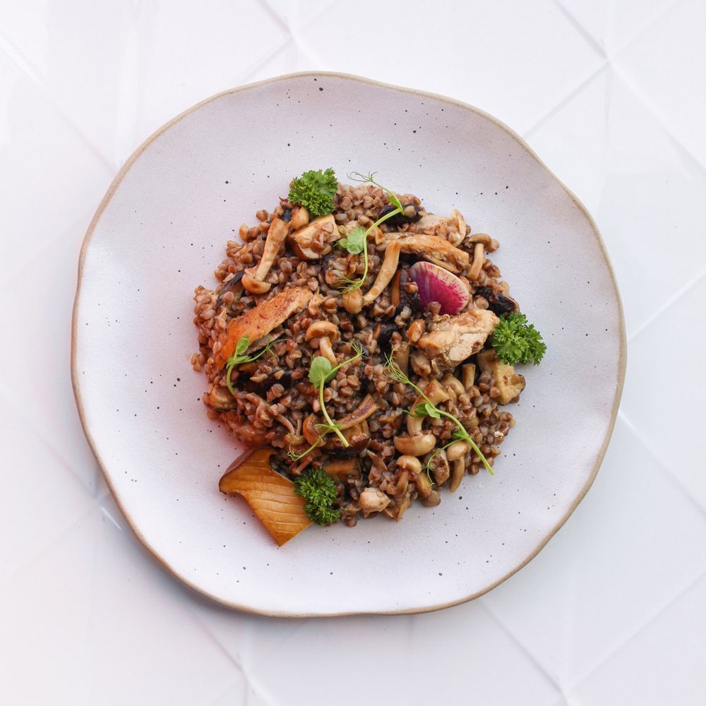 Nutty buckwheat paired with succulent chicken, fried mushrooms, including royal champignons, erengi and shimeji Macros: Kсal 371; Pr 26,6; Fa 7,7; Car 48,6