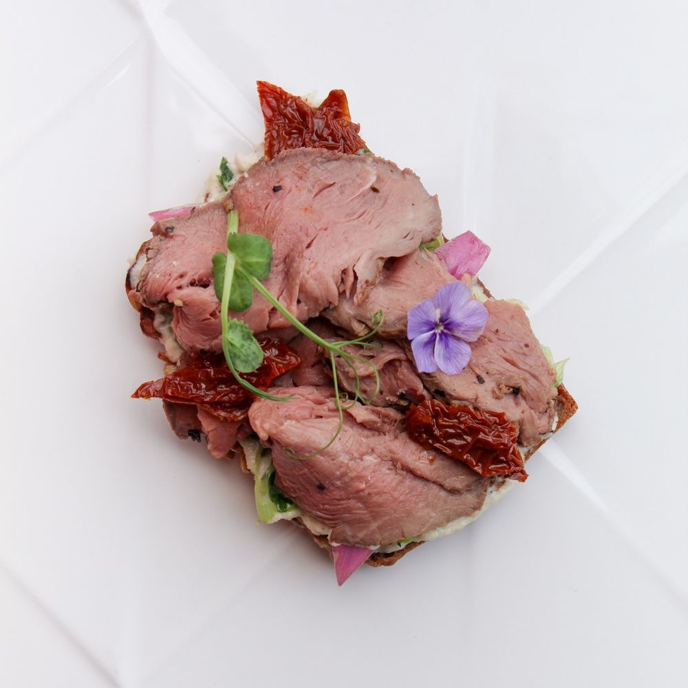 Gluten-free bread with creamy cashew sauce, succulent roast beef, cloves-marinated onions, and sun-dried tomat Macros: Kсal 160; Pr 13; Fa 2; Car 22