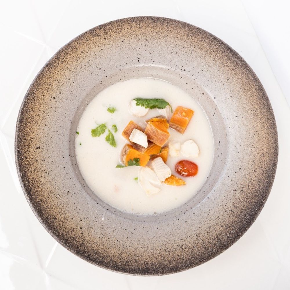 Soup featuring two kinds of tender fish, paired with sweet potato, ripe tomatoes, crisp parsley and coconut milk Macros: Kсal 290; Pr 22; Fa 14; Car 18