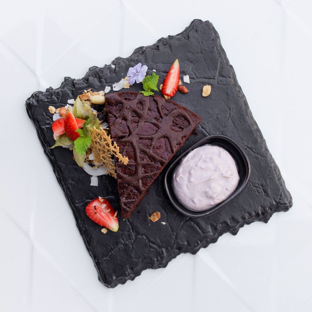 Beetroot and chocolate cake, generously topped with velvety ganache, adorned with fresh berries Kсal 240; Pr 6,5; Fa 10; Car 32