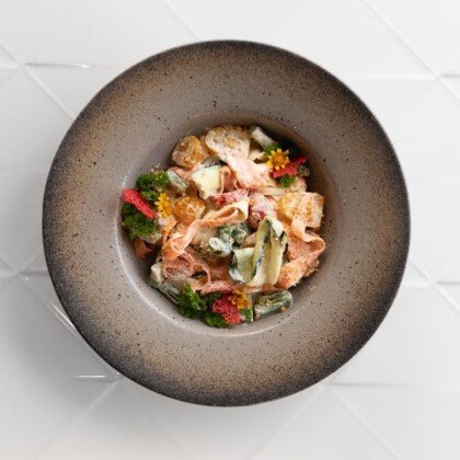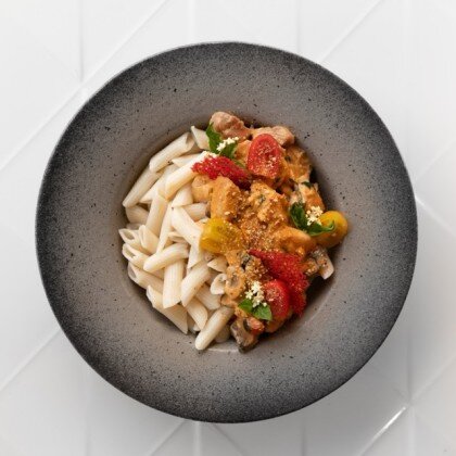Buckwheat noodles, chicken, carrots, spring onions, cabbage, onions, leeks, teriyaki sauce, sesame oil Kсal 479; Pr 24,8; Fa 9,7; Car 73,6