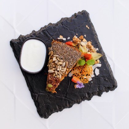 Rolled oatmeal, Almond flour, soy protein, cinnamon, eggs, yogurt, stevia syrup, banana, peanut butter, dark chocolate Kcal 210 Protein 12|Fat 10.5|Carb 18